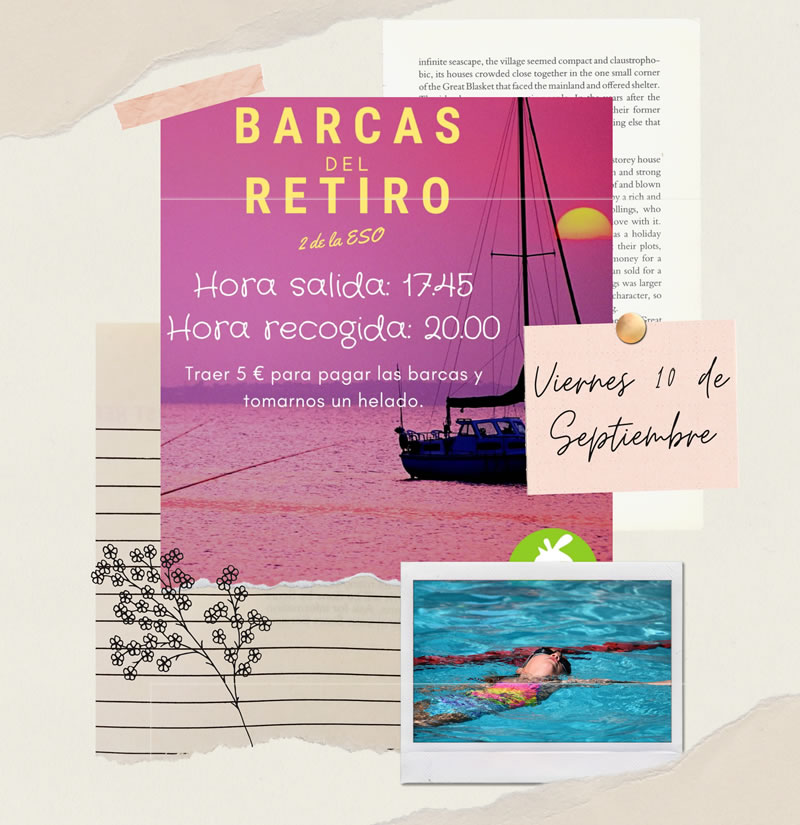 Este viernes empezamos el club con actividades para 6°,1° y 2° ESO: 6° y 1° ESO irán a la piscina (traer bañador y toalla) y 2° ESO irán a las barcas del Retiro y a tomar un helado (traer 5 €). Las de 3°, 4° y 5° empezarán el viernes 17. El horario del club será de 17:30-20:00 para todos los niveles.