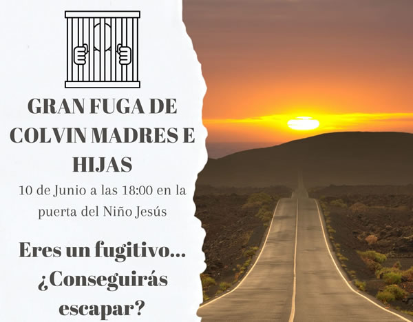 ¡Gran fuga de Colvin madres e hijas! Os esperamos el viernes a las 18:00 h. en la puerta del NIño Jesús. ERes un fugitivo... ¿conseguirás escapar? El reto consiste en escapar del Retiro con los utensilios necesarios y sin que te pillen los policías. Sugerimos que vengáis con gorra y botellas de agua porque hará bastante calor. Contacto: Alexa (646 00 38 86)