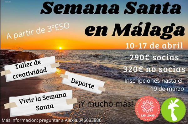 Y a partir de 3ºESO, tendremos una convivencia en Málaga, del 10 al 17 de Abril. Además de vivir la Semana santa malagueña, tendremos un montón de actividades y un taller de creatividad. Precio: 290 €/socias y 320 €/no socias. Más información: Alexia (646 003 886).